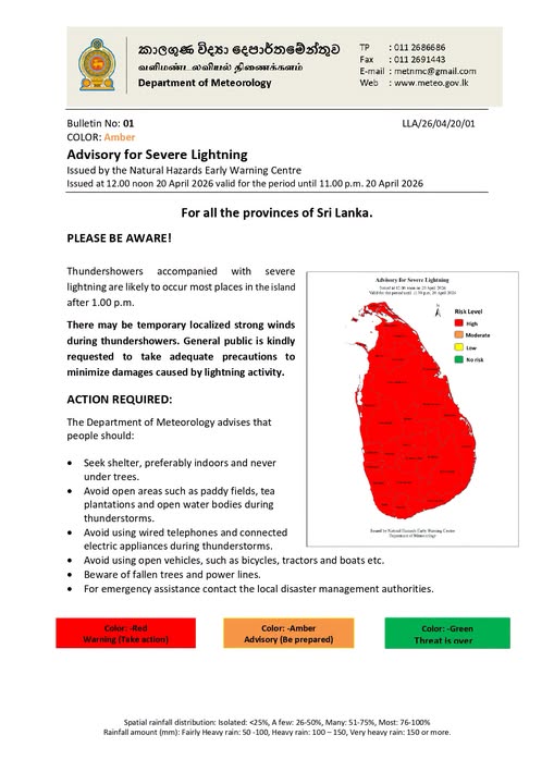 COLOMBO (News 1st); The Department of Meteorology has issued an Amber Advisory for Severe Lightning for all provinces of Sri Lanka, warning of thundershowers accompanied by intense lightning activity.